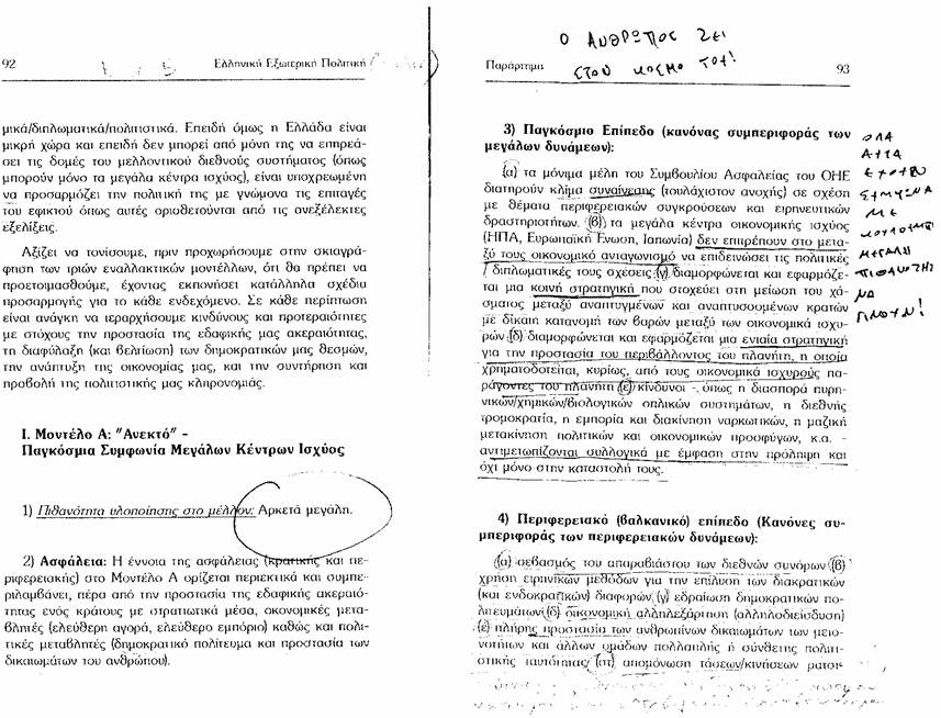 Συγγράφοντας κείμενο για το περίφημο Ίδρυμα και τους ηγέτες του ξαναδιαβάζω βιβλιαράκι του 1994 δύο (κατά τα άλλα επίσης προσωπικών φίλων) επιφανών αναλυτών της συμβατικής ελληνικής πραγματικότητας. Προς το παρόν δεν το σχολιάζω περαιτέρω. Οι χειρόγραφες επισημάνσεις δεν είναι δικές μου αλλά λαμπρού διεθνολόγου που προφανώς κατάπληκτος σημείωνε στα περιθώρια ενώ το διάβαζε το 1974. Τις προσυπογράφω και θα τις πολλαπλασιάσω στο κείμενο που γράφω στο οποίο θα ισχύσει η ρήση ότι «η επιστημονική εκδίκηση σερβίρεται κρύα». Προσθέτω ότι εφεξής θα αφαιρέσω όλες τις παραπομπές και θα το δίνω στους πρωτοετείς φοιτητές μου για να το βαθμολογούν. Ίσως και στο δίνω και στην γειτόνισσα που επαγγέλλεται τον τιμημένο τίτλο της νοικοκυράς και επειδή ξέρω ότι βλέπει τα διεθνή γεγονότα στην τηλεόραση ίσως μπορεί και αυτή να βαθμολογήσει προφητείες που στην Ελλάδα σημαίνουν αμείβονται με τίτλους, κοινωνικοπολιτικά αξιώματα και συμβατικές αναγνωρίσεις που δημιουργούν μια παρακμιακή πνευματική ατμόσφαιρα. Ιδιαίτερα όταν πρόκειται για αυτοαναφορικούς μονολόγους που κυριαρχούν στα μέσα ενημέρωσης και σε πολλά πλέον βιβλία ….