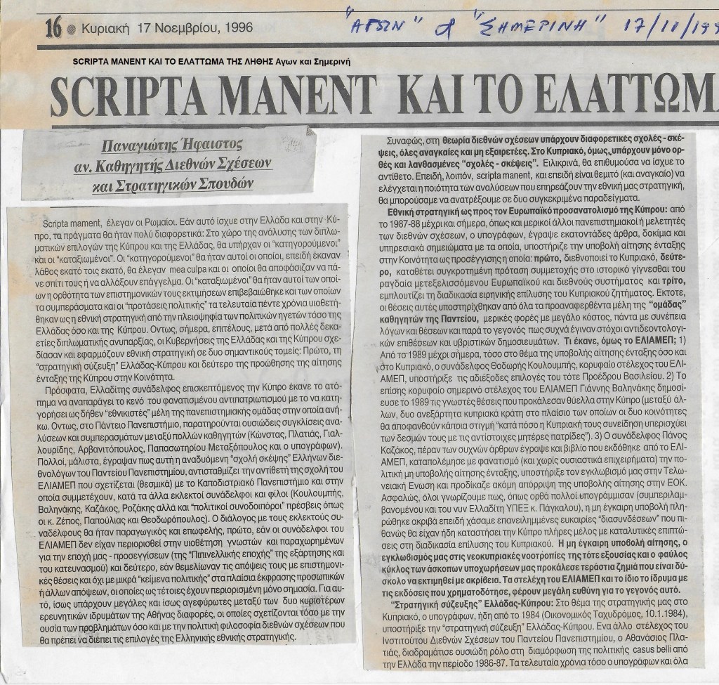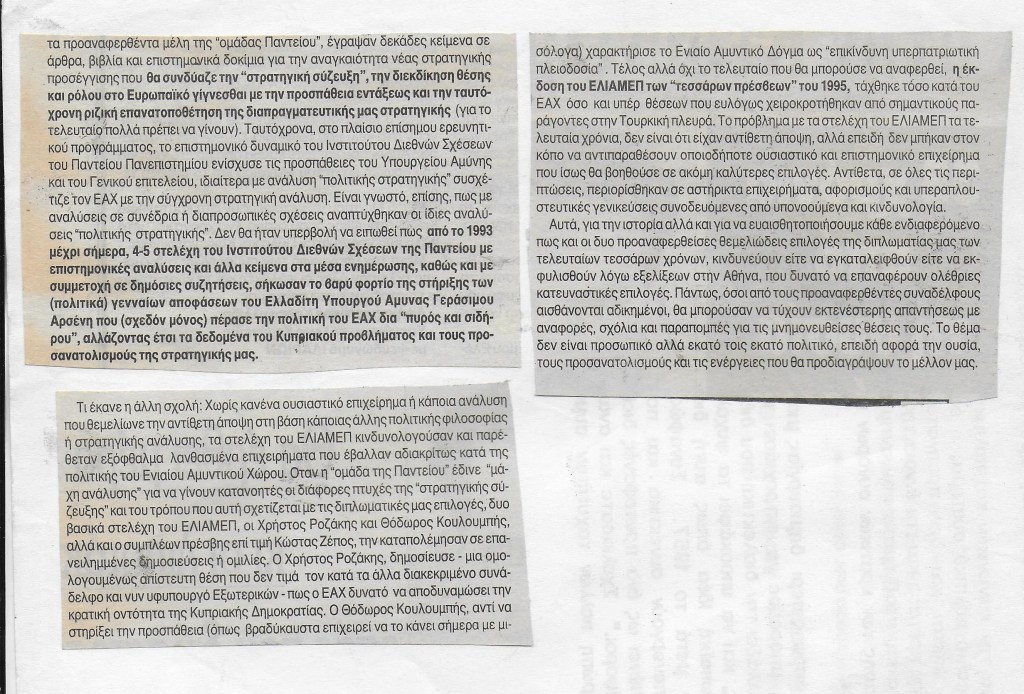 2. Κατά πόσον διαψεύστηκαν ή επαληθεύτηκαν οι θέσεις ενός έκαστου θεσμού ή προσώπου για i) την στρατηγική ευρωπαϊκής λύσης του Κυπριακού, ii) την δομή και μετεξέλιξη των βαλκανικών διενέξεων και iii) την εξέλιξη των ελληνοτουρκικών σχέσεων τα τελευταία δεκαπέντε χρόνια. Κυρίως, ποιες αναλύσεις ήταν «προτάσεις πολιτικής» και ποιες ακαδημαϊκού χαρακτήρα συμβατές με το ακαδημαϊκό λειτούργημα.