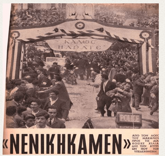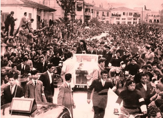 Ο Αρχιεπίσκοπος, ιστάμενος σε ένα αυτοκίνητο ανοιχτής έκδοσης μάρκας Rolls -Royce με αριθμό εγγραφής Α555 (παραχωρήθηκε από τους Εγγλέζους ) συνοδευόταν από δυο μοτοσικλετιστές της Ε.Ο.Κ.Α. (με μηχανές ΒMW που παραχωρήθηκαν δωρεάν από τον εισαγωγέα Πηλακούτα). Ο ένας από τους δυο μοτοσικλετιστές, ο ευρισκόμενος στα δεξιά της Rolls-Royce, χαίρει σήμερα άκρας υγείας. Είναι ο Χαράλαμπος Χριστοφόρου. Ο άλλος πιστεύεται πως είναι ο αείμνηστος Νίκος Μουσιούττας.