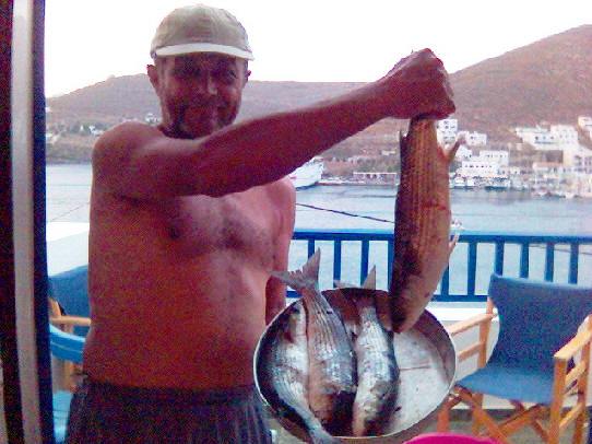 Το κοπάδι από kέφαλους ήταν μεγάλο. Η φωτογραφία απεικονίζει την σοδιά της ημέρας με πολυάγκυστρο κοντά στον Μέριχα της Κύθνου. Μιλάμε για ένα τεράστιο και μοναδικά επιθετικό κοπάδι (η διαπίστωση έγινε με μάσκα) και σε αρκετά δυνατό καιρό (5-6 μποφόρ). Δυστυχώς η απρονοησία μου να έχω αρκετά πολεμοφόδια (χοντρότερες πετονιές και εφεδρικά αγκίστρια δεν έφερε το επιθυμητό αποτέλεσμα (μιας και καθημερινά έπρεπε να τρέφονται τα έξι άτομα της οικογένειας.
