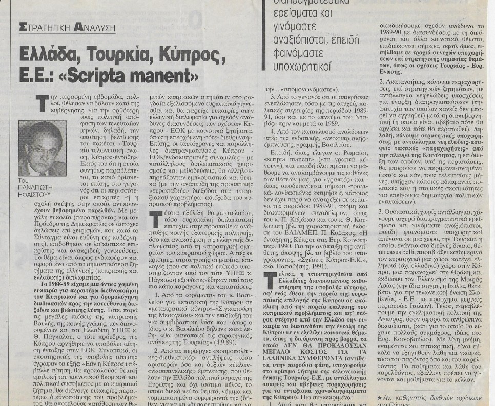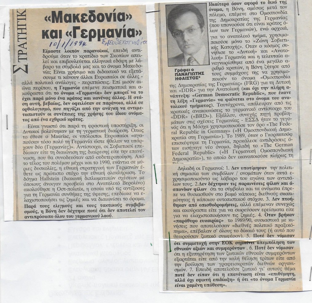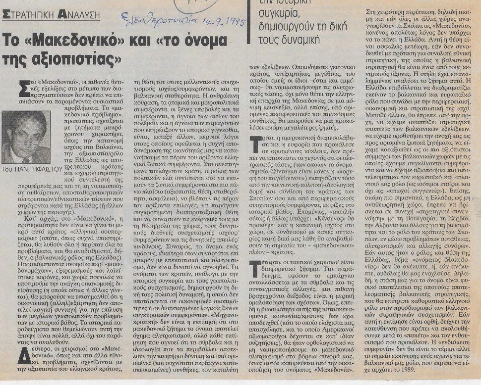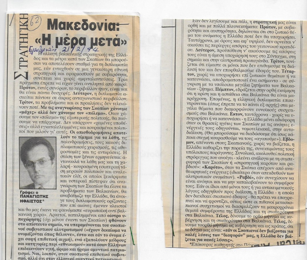 «… Πέμπτο, οι εκτός Βαλκανίων τρίτοι παράγοντες οδηγούνται στο συμπέρασμα ότι η Ελλάδα είναι ένας αγαθός [περιφερειακός] γίγαντας που δεν πρέπει να λαμβάνεται σοβαρά υπόψη στην χάραξη της δικής τους στρατηγικής. Έκτο, ελλείψει στρατηγικής που θα αξιοποιούσε πλήρως τους συντελεστές ισχύος που διαθέτουμε, είναι φυσικό να έχουμε προσκολληθεί σε ασήμαντα πράγματα, όπως η ονομασία της Δημοκρατίας των Σκοπίων …» (Ελευθεροτυπία, στήλη στρατηγική ανάλυση, 8.2.1993).