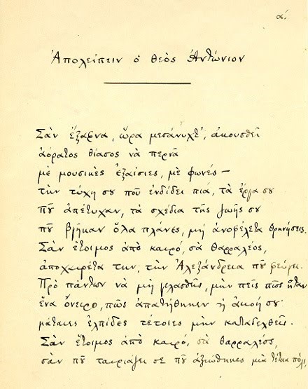 Μετά από αυτή την σύντομη εισαγωγή για μερικά αξονικά ζητήματα τα οποία αναλύονται σε εκτενέστερα κείμενα από πολλούς μη συμβατικούς και μη ιδεολογικά σκεπτόμενους στοχαστές, θα περιοριστούμε στην παράθεση μερικών ποιημάτων του μεγάλου Αλεξανδρινού. Μαζί και την μοναδική μουσική τους απόδοση από τον υιό Χατζή, τον Αλέξανδρο Χατζή.