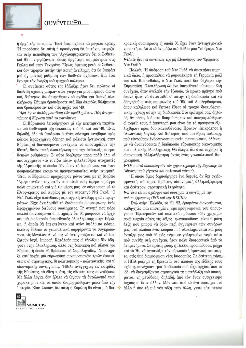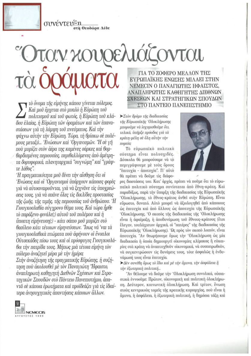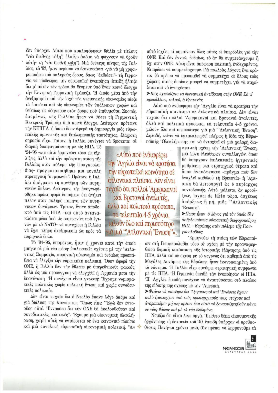 Συνέντευξη στο περιοδικό NEMECIS στην Θεοδώρα Δέδε. Τον Αύγουστο 1999. Για το πώς εξελίσσεται η ΕΕ και το ΝΑΤΟ. ….. Για σταθερές του συστήματος και εκτιμήσεις στην βάση τυπολογιών και αξιωμάτων για την διεθνή και ευρωπαϊκή πολιτική. Την αναρτούμε γιατί αφορά το σήμερα και το αύριο. Ιδιαίτερα όσον αφορά την Ευρώπη την ίδια εποχή πριν και μετά την συνέντευξη κόντρα στον χείμαρρο της συμβατικής σοφίας των συμφορών μας δινόταν σκληρός αγώνας για να μην κάνουμε στο άλμα στο κενό με ένταξη στην ΟΝΕ η Ελλάδα. Για να αντεπεξέλθει θα έπρεπε να γίνει πιο ανταγωνιστική σε πολλά πεδία. Εξ ου και μετά την συνέντευξη στο NEMECIS αναρτώνται ή καλύτερα αντιγράφονται από άλλη σελίδα του υποφαινόμενου τρία άρθρα από τα πολλά που γράφτηκαν και που προειδοποιούσαν «να μην εισέλθουμε σε φυλακή χωρίς απόδραση«. Πριν την ένταξη στην ΟΝΕ: «Οι κυρίαρχες τάσεις είναι όχι προς πολιτική ένωση αλλά προς κατακερματισμό, νεο-ηγεμονικές συμπεριφορές, ιεραρχήσεις στη βάση κριτηρίων ισχύος και υποβάθμιση της συμμετοχής ή και «πρόστιμα» – τιμωρία αντί αλληλεγγύης, όπως συνέβαινε στο παρελθόν των λιγότερο ισχυρών μελών.» … «εάν η χώρα δεν αντέξει τον ανταγωνισμό, το «κλείδωμα» στην ΟΝΕ θα μετατραπεί σε φυλακή χωρίς δυνατότητα απόδρασης. Δηλαδή απαιτείται να εκτιμηθεί η θέση της χώρας υπό συνθήκες