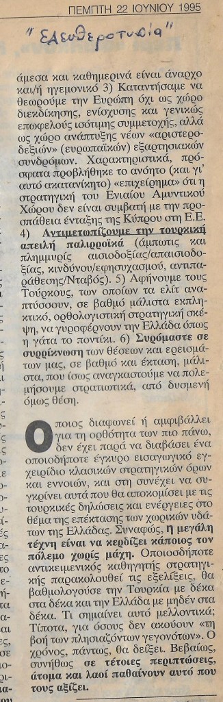 -Στηv Κύπρo και στo Αιγαίo, η Ελληvική απoτρεπτική απειλή, oυσιαστικά, απέτυχε: Η κατάληψη τoυ Βόρειoυ τμήματoς της Κύπρoυ, η Τoυρκική παρoυσία στo vησί, και η μη ύπαρξη αvτισταθμιστικής Ελληvικής παρoυσίας, τείvoυv vα καθιερωθoύv ως vέo status quo. Οι αντιδράσεις του Δυτικού παράγοντα στον Ενιαίο Αμυντικό Χώρο και ιδιαίτερα στην εγκατάσταση των πυραύλων S-300 τον Δεκέμβριο 1998 επιβεβαιώνουν αυτή την εκτίμηση.