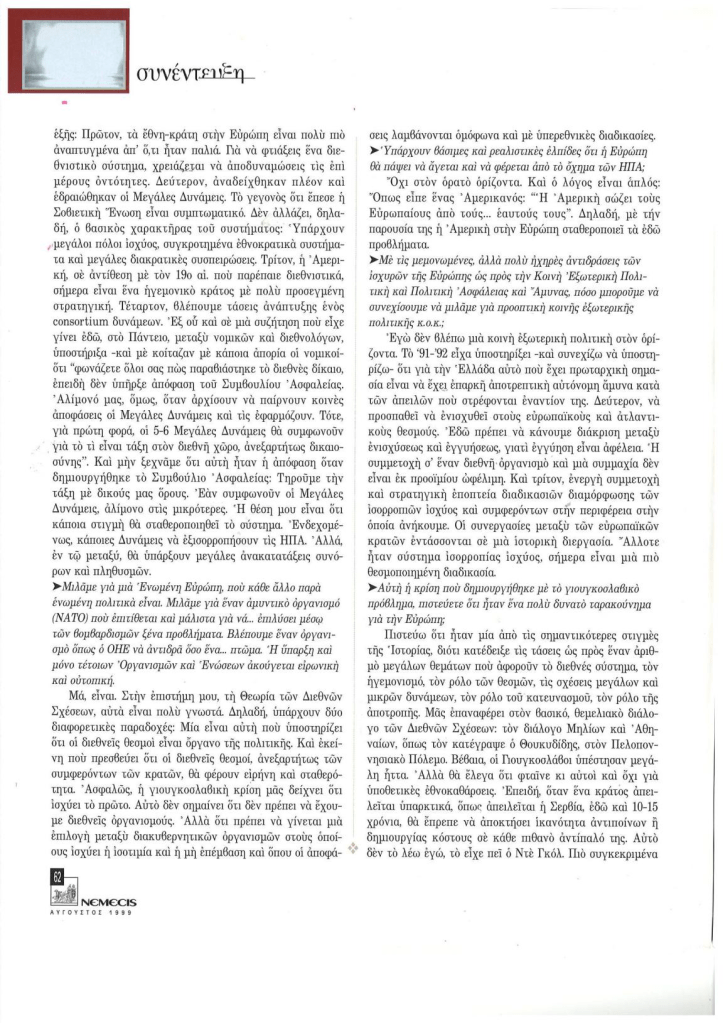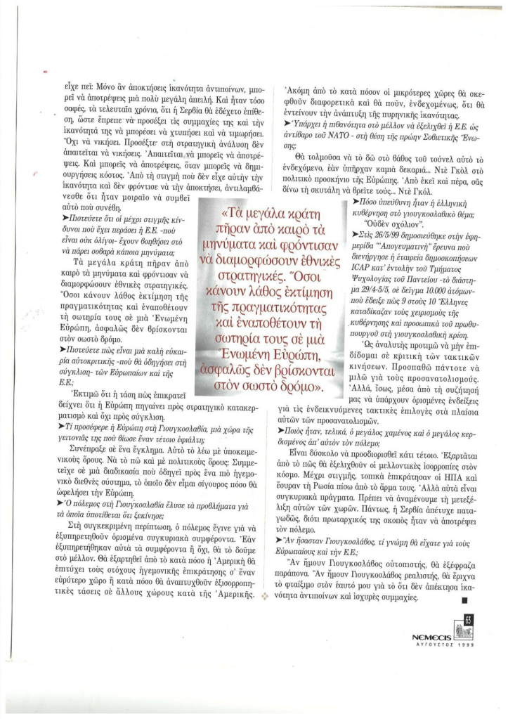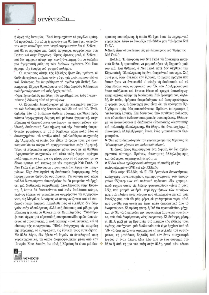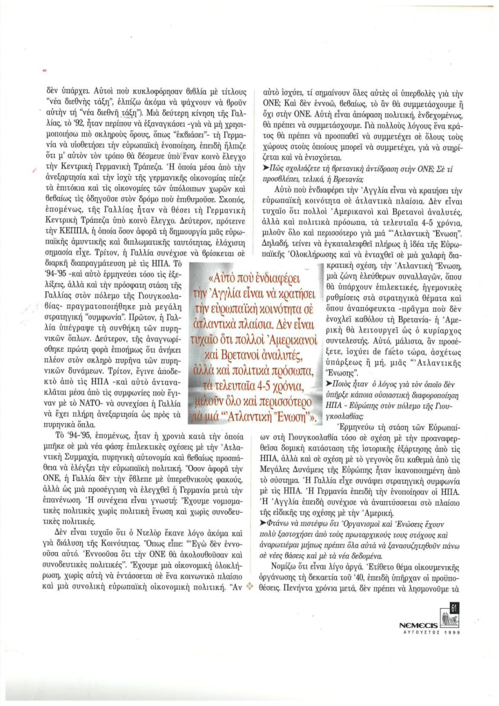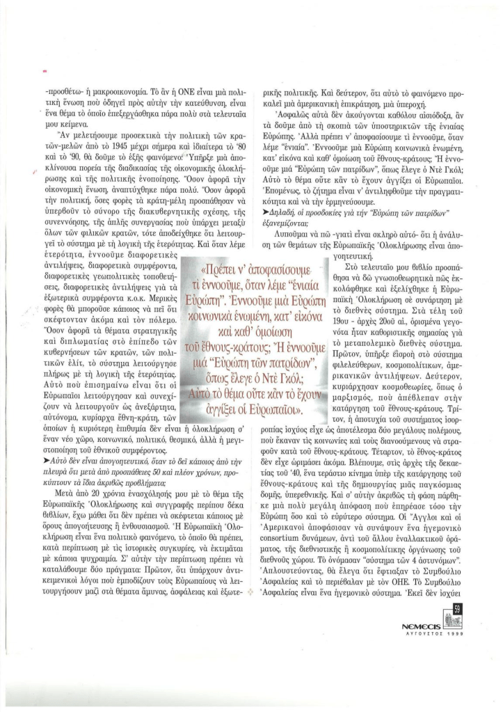 Έκτον, για τους πιο πάνω και πολλούς άλλους λόγους, η συμμετοχή της Ελλάδας στην Ε.Ε. την οποία κανείς νοήμων δεν αμφισβητεί αναπτύσσεται πλέον με τον ίδιο τρόπο που συμβαίνει σε κάθε άλλο διακρατικό σύστημα: σκληρός ανταγωνισμός. Όπως δείχνουν εξάλλου οι επιλογές τριών άλλων κρατών της Ε.Ε., η άμεση συμμετοχή στην ΟΝΕ δεν είναι αυτοσκοπός. Τα συμφέροντά μας δεν εξυπηρετούνται αν αυτό σημαίνει: 1) οικονομική και πολιτική καθυπόταξή μας, εάν και όταν θα ενταχθούμε στην ΟΝΕ, 2) εκδίωξη αντί αλληλεγγύης από τον «σκληρό πυρήνα», αν αποτύχουμε π.χ. κατά 1% στον πληθωρισμό (βλ. πρόσφατες δηλώσεις Πρόντι), 3) χαλάρωση όσον αφορά την τουρκική απειλή και αποδυνάμωση στην περιφέρειά μας.