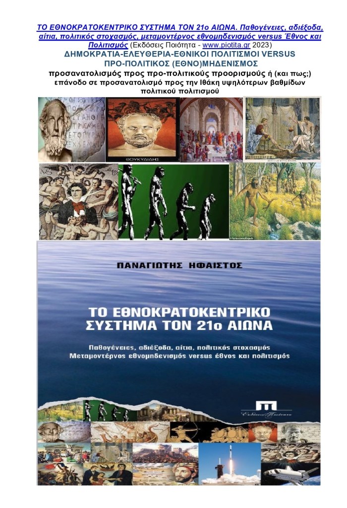 ««Το εθνοκρατοκεντρικό σύστημα τον 21ο αιώνα. Παθογένειες, αδιέξοδα, αίτια, πολιτικός στοχασμός, μεταμοντέρνος εθνομηδενισμός versus Έθνος και Πολιτισμός» https://piotita.gr/?p=41774