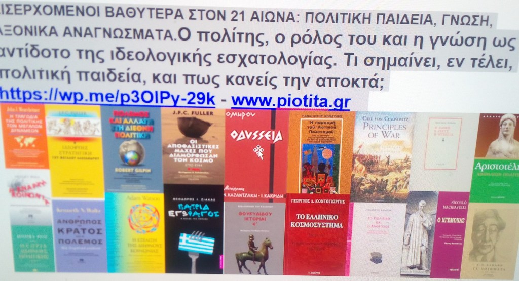 «ΤΟ ΕΘΝΟΚΡΑΤΟΚΕΝΤΡΙΚΟ ΣΥΣΤΗΜΑ ΤΟΝ 21ο ΑΙΩΝΑ. Παθογένειες, αδιέξοδα, αίτια, πολιτικός στοχασμός, μεταμοντέρνος εθνομηδενισμός versus Έθνος και Πολιτισμός» https://piotita.gr/?p=41774