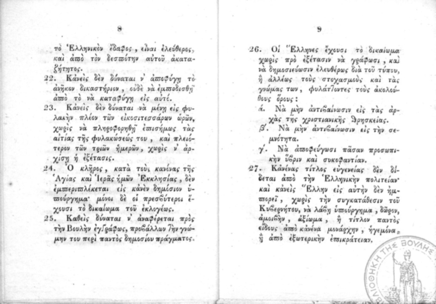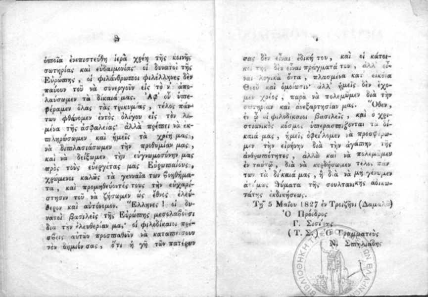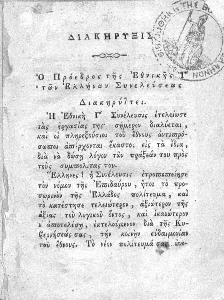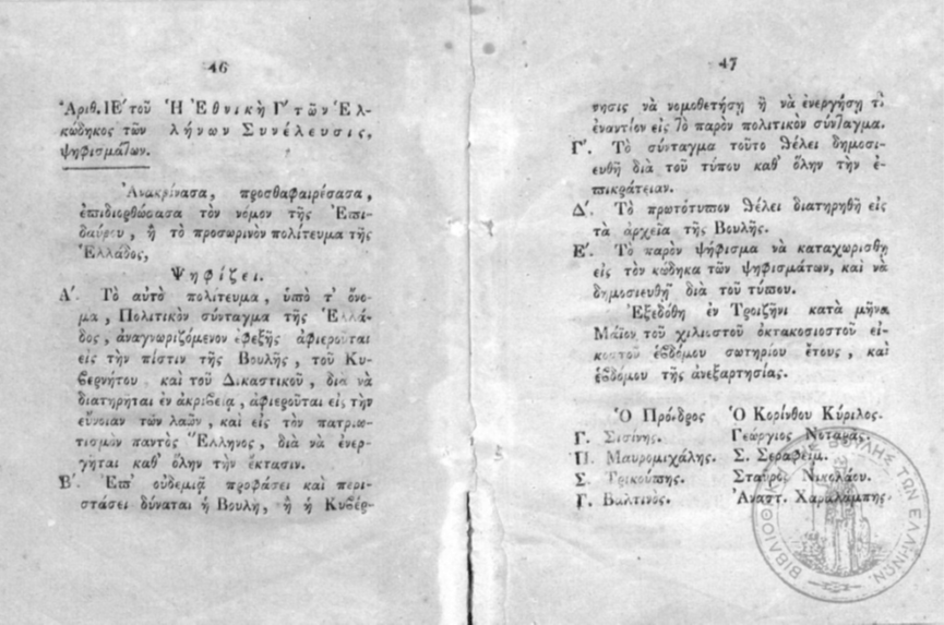 Στο τέλος παρατίθεται το ψήφισμα της Εθνοσυνέλευσης των Επαναστατημένων Ελλήνων και το «Πολιτικόν Σύνταγμα της Ελλάδας». Γράφοντας αυτές τις γραμμές και ανεξάρτητα της οδυνηρής καθημερινότητας που οφείλεται σε παρακμιακά φαινόμενα πέραν κάθε φαντασίας, δύο αιώνες μετά την Εθνεγερσία η πλειοψηφία των συγχρόνων Ελλήνων πολύ θα ήθελαν νεκρανάσταση των κολοσσιαίου πολιτικού, πνευματικού και κοσμοθεωρητικού αναστήματος Επαναστατών της Εθνεγερσίας των Ελλήνων. Πολλοί όπως ο Μακρυγιάννης ήταν και αναλφάβητοι αλλά διέθεταν πάμπλουτη πολιτική παιδεία και δημοκρατικές παραδοχές υψηλοτάτων βαθμίδων που σμιλευόταν επί αιώνες μέσα στις Πόλεις και τα Κοινά (ακόμη και κατά την διάρκεια της τουρκοκρατίας). Τα παραμιλητά φορέων μηδενιστικών παραδοχών και οι κακόπιστες αλματώδεις εκλογικεύσεις που συνοδεύονται από συνειδητά ψεύδη γελοιοποιούνται μόνο και μόνο αν κανείς διαβάσει τα ψηφίσματα των Εθνοσυνελεύσεων ή τα απομνημονεύματα του Μακρογιάννη ή τις δηλώσεις όλων των άλλων. Τόσο όσον αφορά τον απαράμιλλο ηρωισμό για την ανεξαρτησία των Ελλήνων όσο και την αξίωση για δημιουργία δημοκρατικών δομών όταν στην Ευρώπη είχαμε δεσποτικές αποικιοκρατικές ηγεμονίες που κήρυτταν «όχι επαναστάσεις όχι δημοκρατία» και που εκτελούσαν εκτεταμένες εθνοκαθάρσεις.