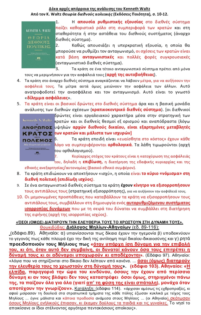 Τέλος παραθέτω, δέκα αρχές απόρροια της ανάλυσης του Kenneth Waltz όπως τις συνόψισε ο συνάδελφος καθηγητής Αθανάσιος Πλατιάς στο έξοχο εισαγωγικό σημείωμά του στο Θεωρία Διεθνούς Πολιτικής.