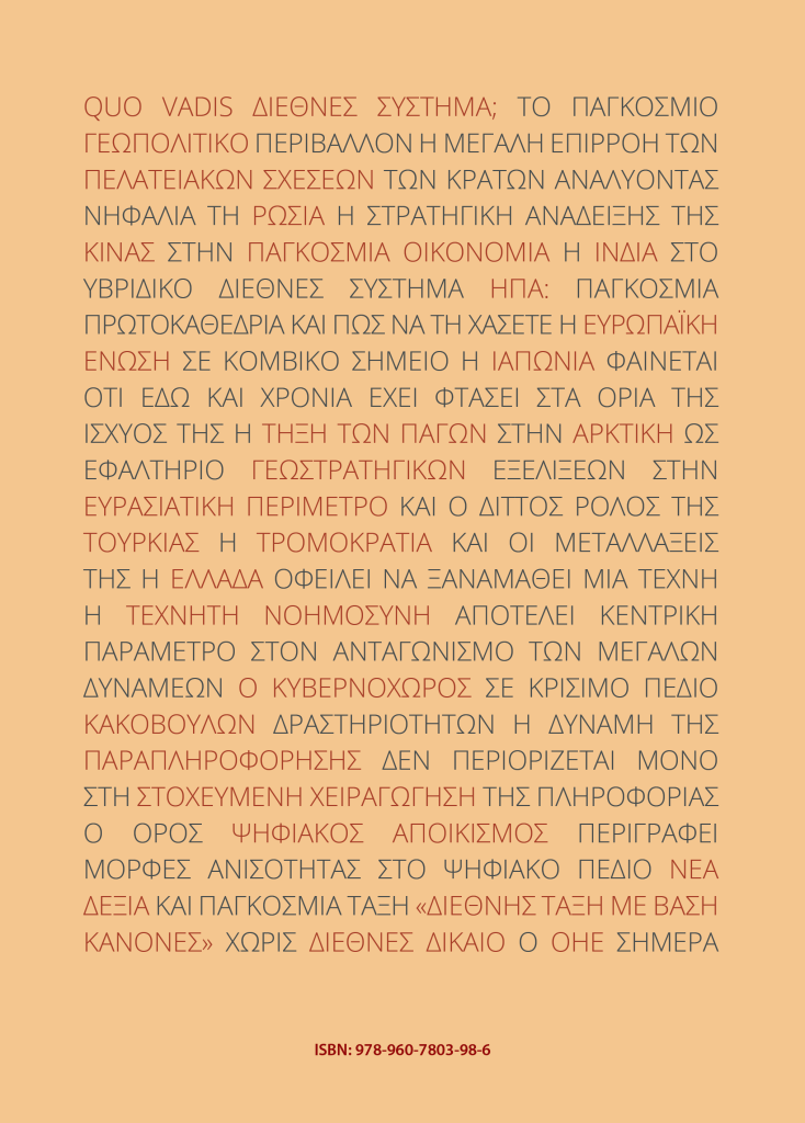 Ο τόμος περιέχει 21 δοκίμια διακεκριμένων αναλυτών των διεθνών σχέσεων τα οποία εξετάζουν τις δομές, τους προσανατολισμούς και τις εξελισσόμενες τάσεις και διαμορφωτικές προϋποθέσεις του διεθνούς συστήματος καθώς κινούμαστε βαθύτερα στον 21ο αιώνα. Συγκροτούν ένα εξαιρετικό συλλογικό έργο και μια εμβληματική παρέμβαση στα πεδία της στρατηγικής, της γεωπολιτικής/γεωστρατηγικής, της οικονομίας, των διεθνών θεσμών, του διεθνούς δικαίου, του ΟΗΕ, των μεθοδεύσεων των λιγότερο ισχυρών κρατών στις συναλλαγές τους με πιο ισχυρά κράτη, και σημαντικών ζητημάτων όπως η τρομοκρατία, η τεχνητή νοημοσύνη, η πληροφοριακή χειραγώγηση και οι εν γένει γενικότερες προεκτάσεις στην πολιτική και στην πολιτική σκέψη.