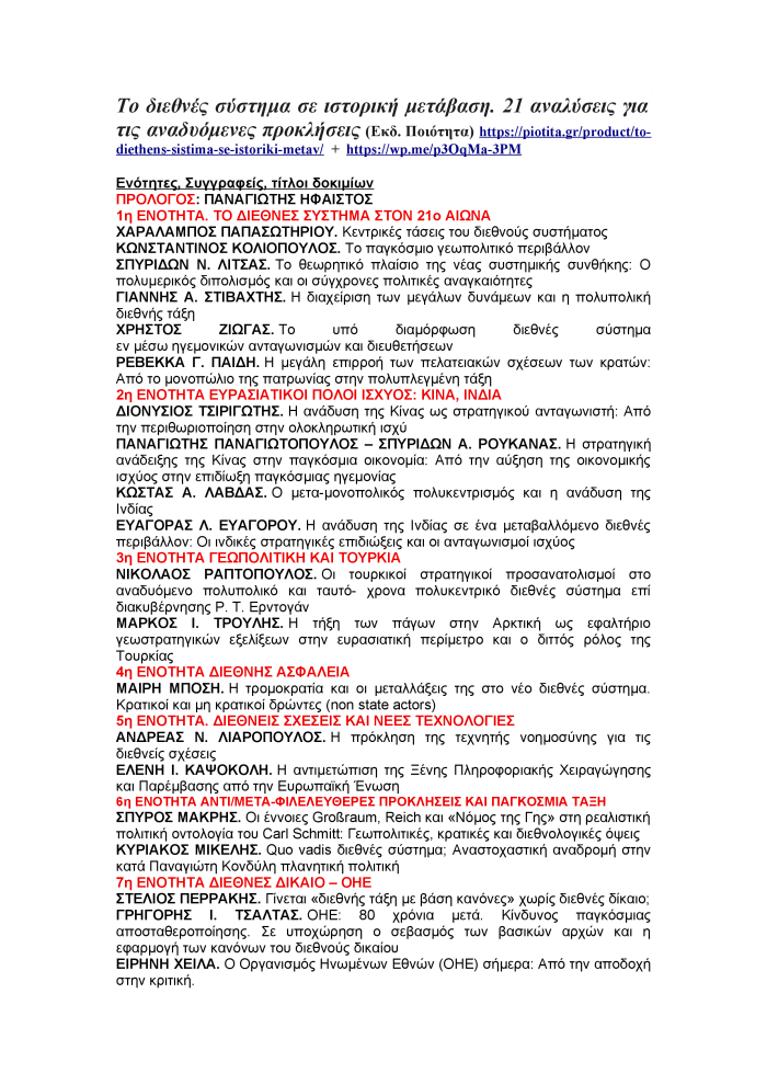 ΤΟ ΔΙΕΘΝΕΣ ΣΥΣΤΗΜΑ ΣΕ ΙΣΤΟΡΙΚΗ ΜΕΤΑΒΑΣΗ. 21 ΑΝΑΛΥΣΕΙΣ ΓΙΑ ΤΙΣ ΑΝΑΔΥΟΜΕΝΕΣ ΠΡΟΚΛΗΣΕΙΣ (Εκδόσεις Ποιότητα) – www.piotita.gr